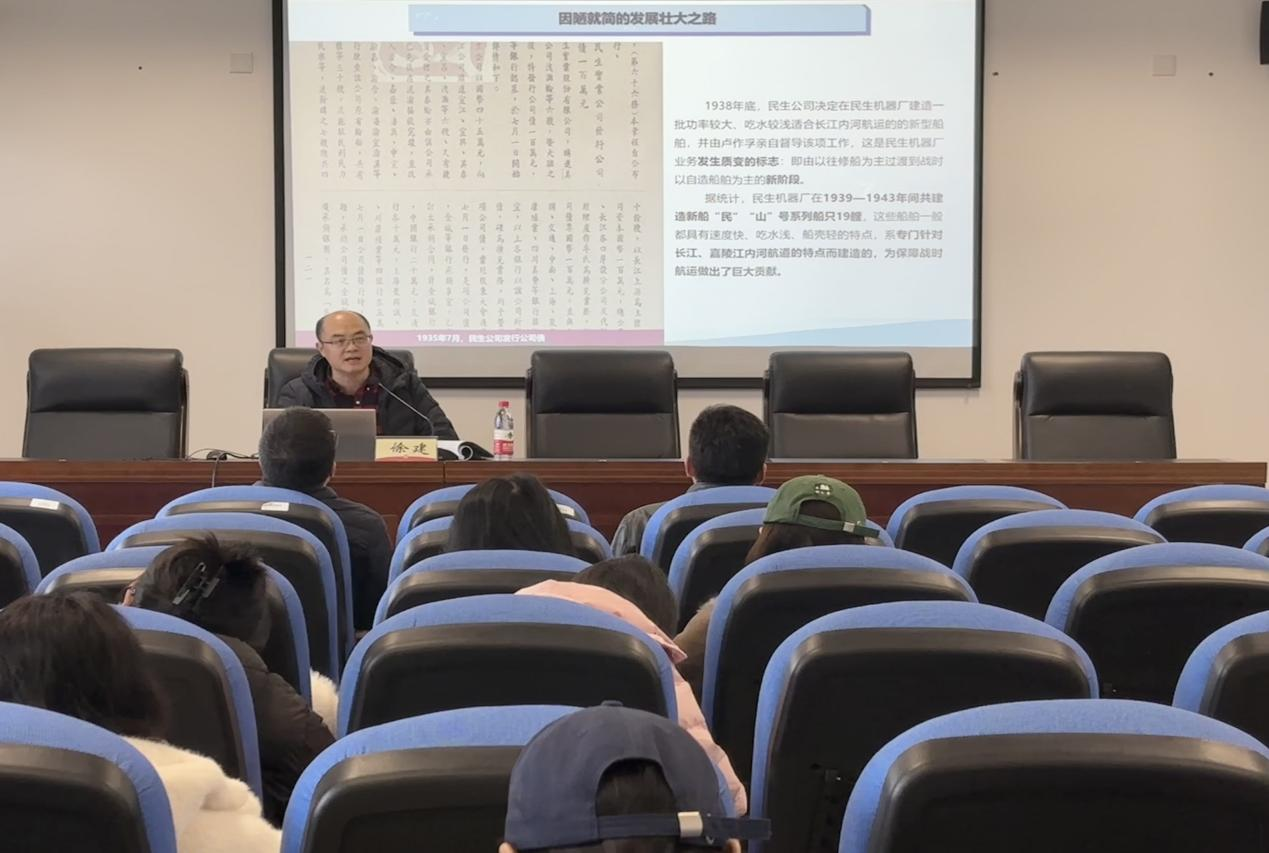 徐建博士以《国运与航运——全面抗战时期的民生公司》为题,围绕民生公司“为收回利权而生、为民族自由而战、为新中国留下宝贵财富”三大核心主线。讲述“中国船王”卢作孚在全面抗战期间依托民生公司积极参与实业救国的历史故事,使师生们深刻领悟了以卢作孚为代表的老一辈爱国企业家精神的丰富内涵、鲜明特质,彰显了其时代价值和独特魅力,为从历史视角研究企业家精神的提供了宝贵经验。